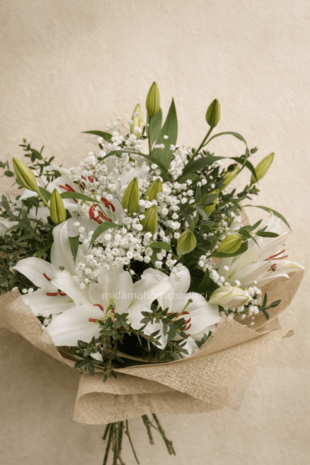 Un bouquet essenziale e luminoso, dove i lilium bianchi dialogano con il verde naturale in un equilibrio silenzioso.